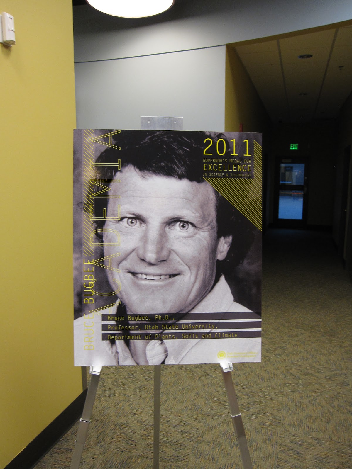 Last night (10 Jan 2012) Dr. Bruce Bugbee was awarded the Governor’s Science and Technology Medal for 2011 at an awards banquet held in the Discovery Gateway Children’s Museum. When the medal was presented to Bruce by Governor Herbert, a few accomplishments from Bruce’s work at Utah State University and at Apogee Instruments were briefly mentioned. Before the banquet several of Bruce’s guests were conversing and the question came up of regarding the nomination process and what Bruce had done to merit such consideration. Bruce replied that he had done “nothing in the past year” that was deserving of the award, but that rather it was something of an acknowledgment of lifetime achievement. My disagreement with this statement is that in the seven years I have personally known Bruce he has not slowed down one bit and has many years of achievement ahead of him.